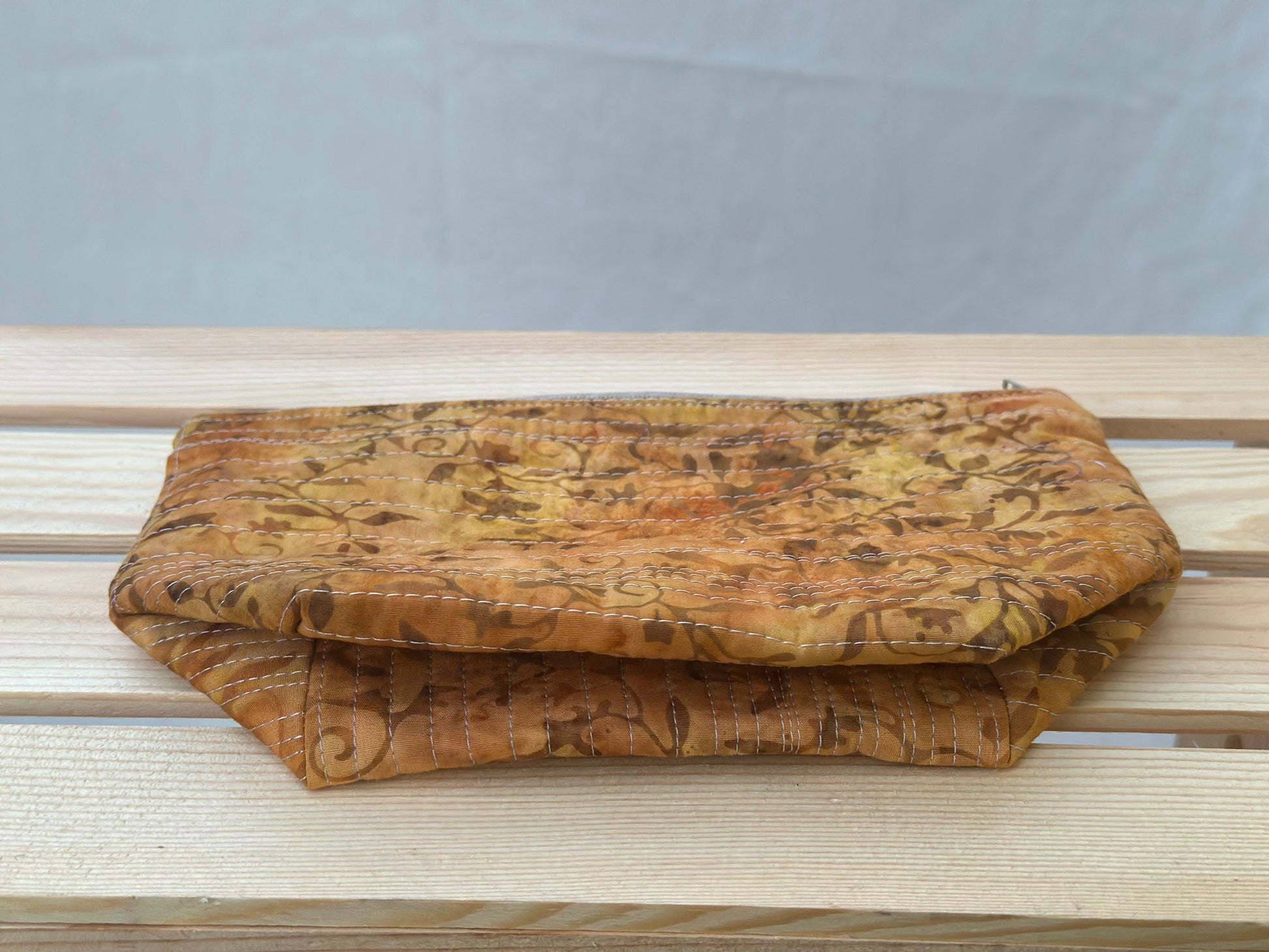Crafted from soft cotton with a vibrant autumn floral batik design, this makeup bag blends style and practicality effortlessly. At 5" tall by 9" wide, it stands upright on its own for easy access and folds flat to tuck away anywhere. Handmade with care, it’s the perfect companion to keep your essentials organized anywhere, anytime.