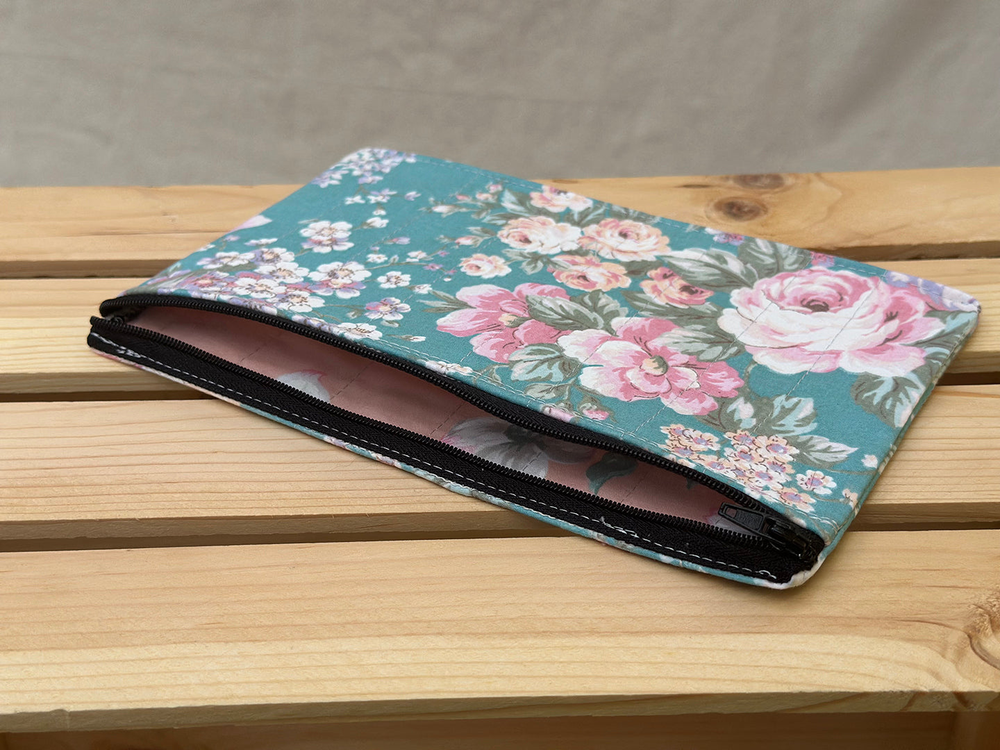 The Brushed Floral Garden Slimline Zip Pouch features an elegant blend of pink floral motifs set against a vibrant teal backdrop. Measuring 8" wide by 5" tall, its vertical quilting lines add a refined touch, while the front-facing zipper allows it to open flat for easy access. This charming, practical bag keeps your essentials beautifully organized wherever you go.