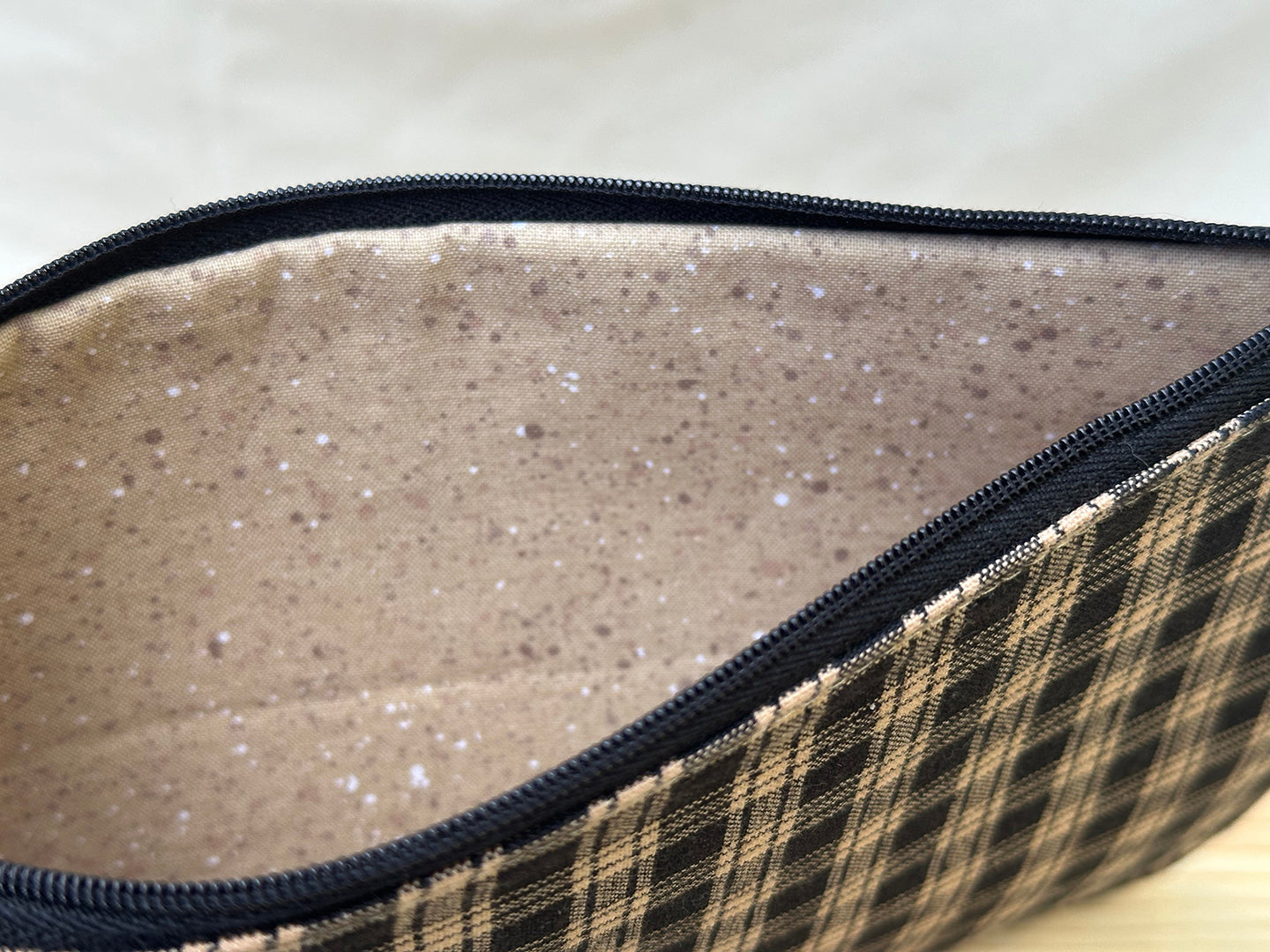 Elevate your everyday essentials with this Checkered Antique Gold & Black Slimline Zip Pouch. Measuring 9.5" wide by 5.5" tall, it features a sophisticated gold and black plaid pattern layered with soft cotton interfacing for durability and a plush feel. Its timeless design suits any occasion, making it the perfect stylish companion to keep your must-haves organized and ready to impress.