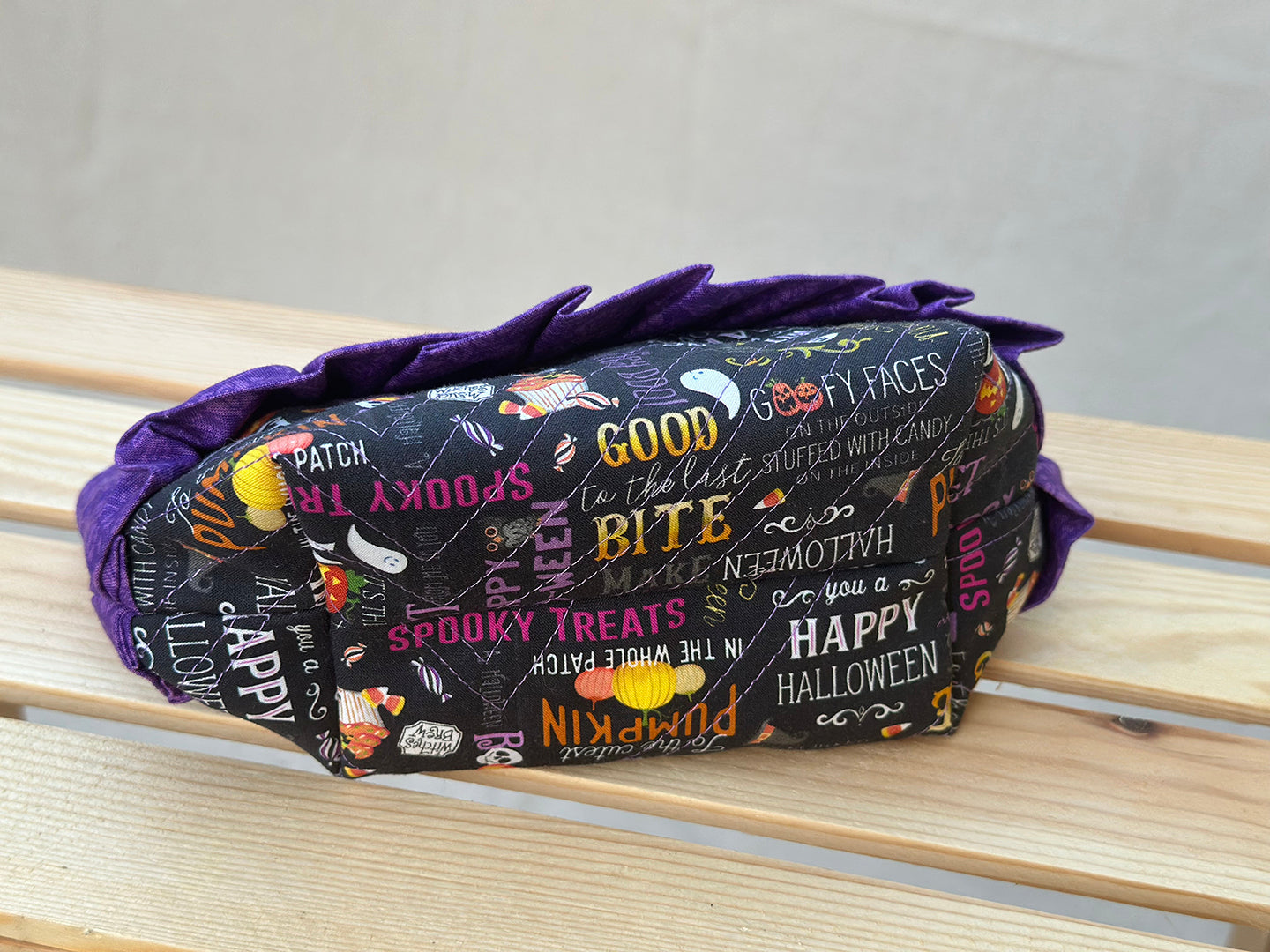 Add a dash of spooky charm to your season with this handmade Halloween Ruffle Makeup Bag. Crafted from soft cotton fabric, its playful colors extend all the way through the zipper, revealing a bright yellow interior that makes finding your essentials a breeze. Compact yet roomy at 8" wide by 6" tall, it’s perfect for keeping your makeup or small treasures neatly tucked away with a spirited flair.
