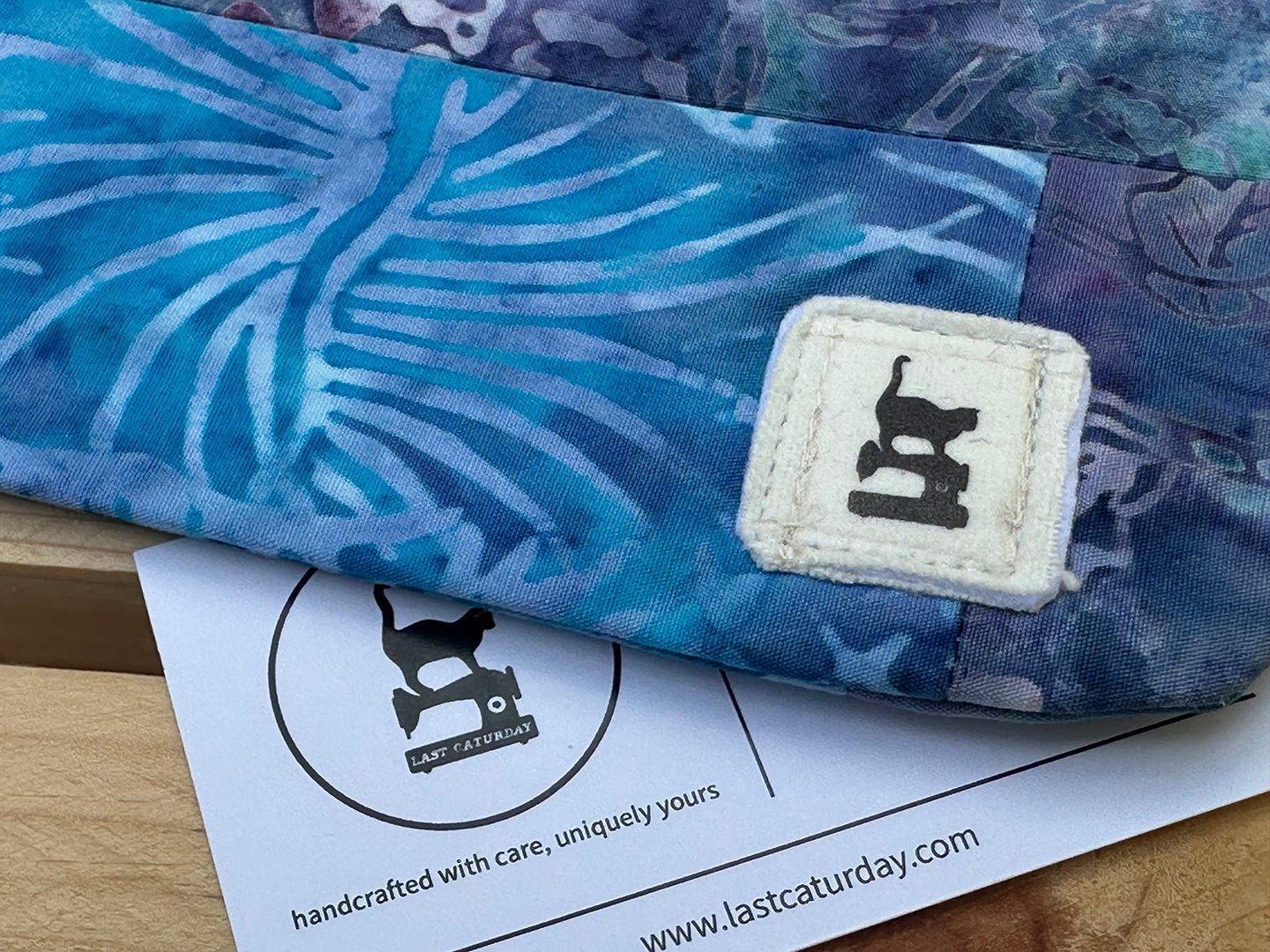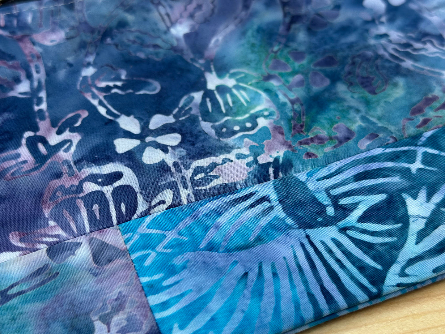 Crafted by hand from soft cotton, the Life Aquatic Slimline Zip Pouch blends all the colors from the batik fabric to highlight the delicate floral hints with a subtle aquatic vibe. Measuring larger than its namesake counterpart at 10" x 6", t’s the perfect compact companion to carry your essentials with a splash of charm and tranquility.