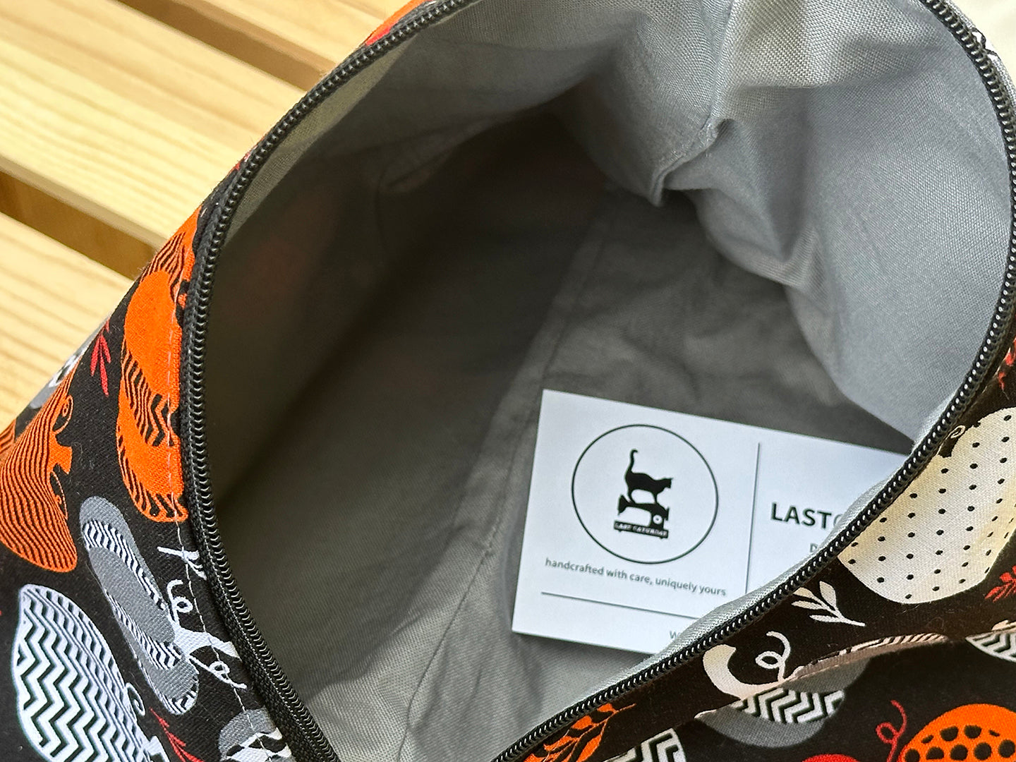 Discover the Pumpkin Overload Triangle Makeup Bag, a charming handmade cotton pouch designed to brighten your routine. Its unique triangular shape offers stylish storage, while a secure zipper keeps your essentials safe. The exterior hook lets you easily attach it to your purse or tote for convenience on the go. Inside, the soft light gray lining perfectly matches the subtle grays in the festive pumpkin pattern, blending function with seasonal flair. It would do great for small cosmetics or as an ID and loose change purse. Measuring approximately 4.5" around the sides and 3.5" tall, this bag is perfectly crafted to keep your small items organized with a dash of playful character.